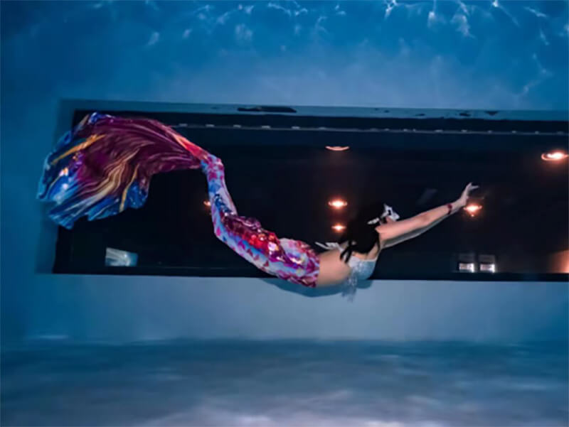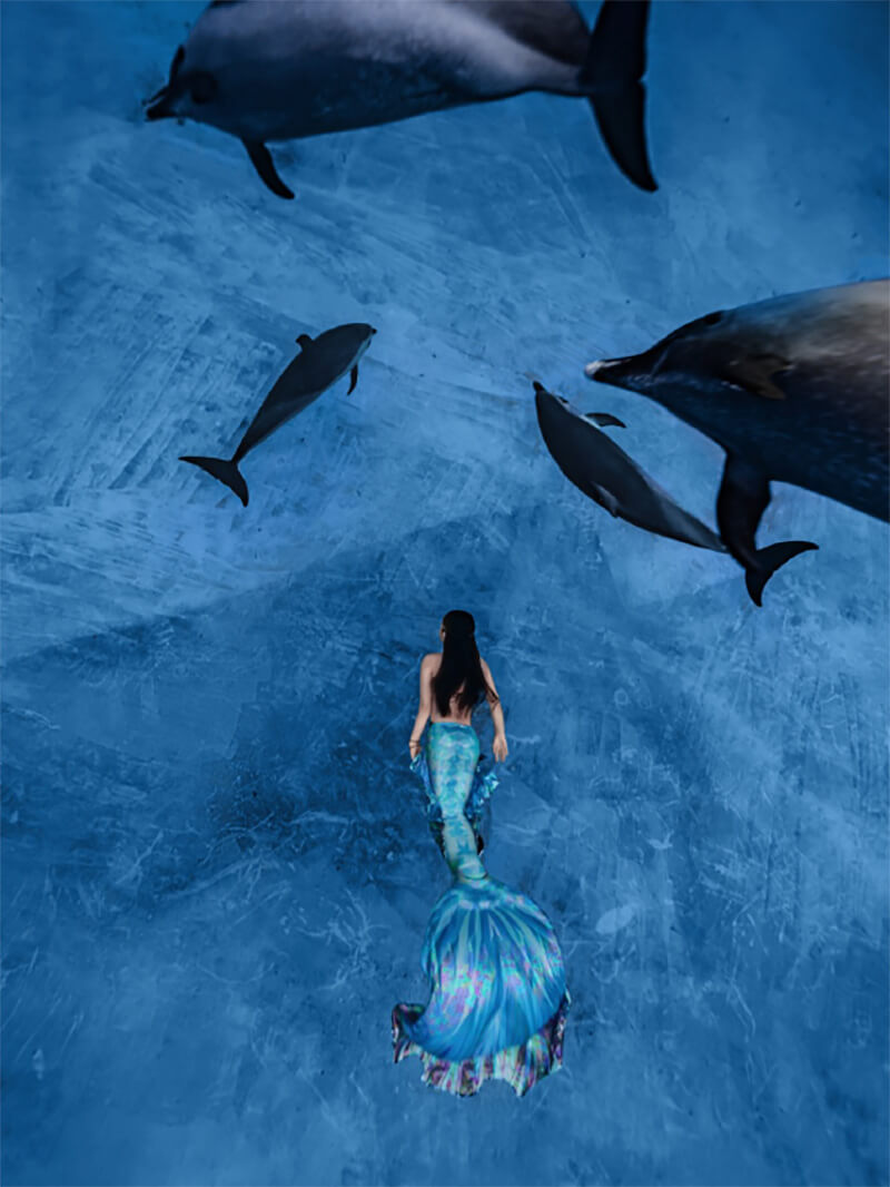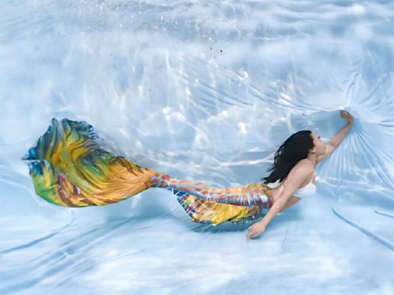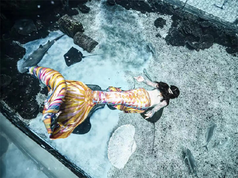 『ベタ(Betta)』の生地はすべて画像のようなウロコ状のラメ生地となっています。厚みは薄手で、コンパクトに収納できる上、水切れが良く乾きやすい特徴があります。旅行先でのマーメイドスイムにオススメです。